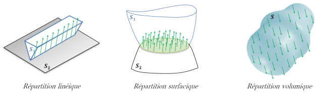 Les actions mécaniques rencontrées jusqu'ici ont été modélisées d'un point de vue global. En regardant de plus près, les AM exercées par un système matériel sur un autre se répartissent sur un élément de volume ou de surface voire sur un élément linéique.