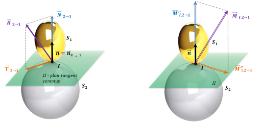 \[\overrightarrow{M}_{I, \,2\rightarrow 1}=\overrightarrow{M}_{I, \,2\rightarrow 1}^P+\overrightarrow{M}_{I, \,2\rightarrow 1}^R \quad \text{ , avec } \left\{\begin{array}{l} \overrightarrow{M}_{I, \,2\rightarrow 1}^P \perp (\Pi)\quad\text{(moment de pivotement)}\\ \overrightarrow{M}_{I, \,2\rightarrow 1}^R\in (\Pi)\quad\text{(moment de roulement)} \end{array}\right.