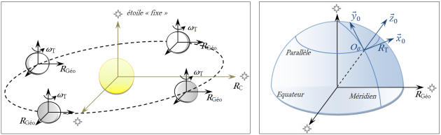 Référentiel terrestre (ou du laboratoire) | Lié à la surface terrestre | Fixes par rapport à la Terre | \(T_{exp} \approx 30min<< 24h\) |